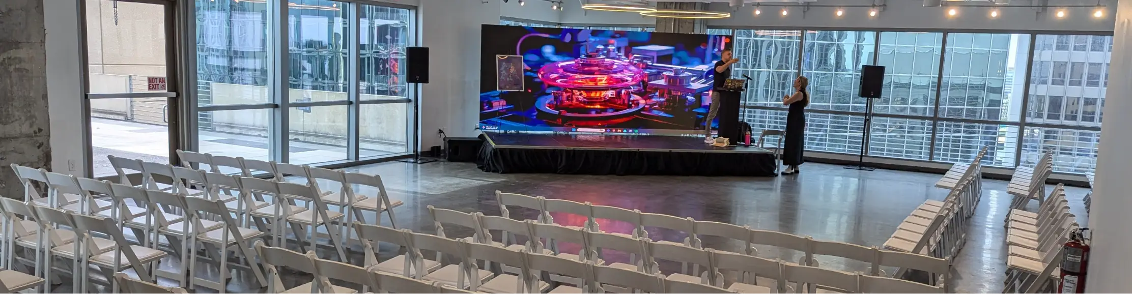 Theater-style seating works well for keynote speakers, company updates, and larger presentations. This setup keeps attention directed toward the front of the room while allowing attendees to remain comfortable and focused.