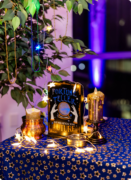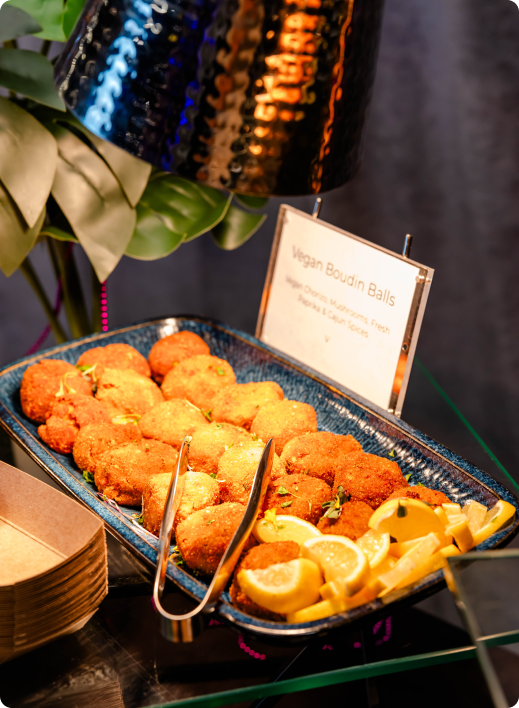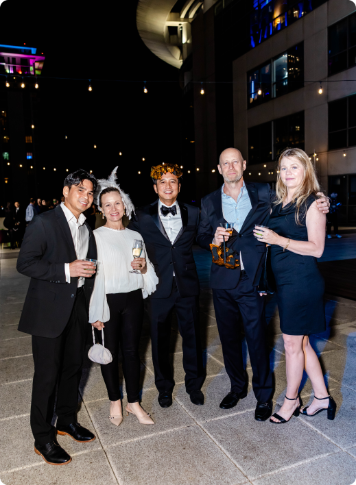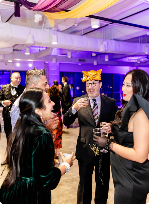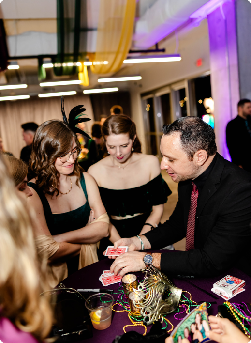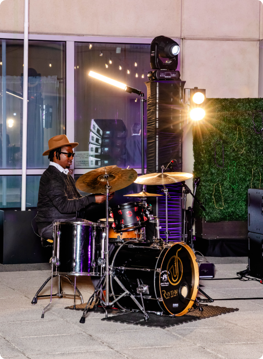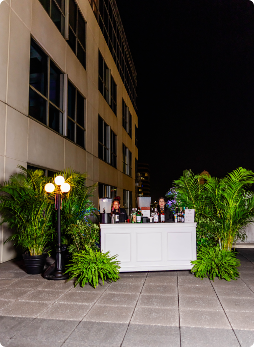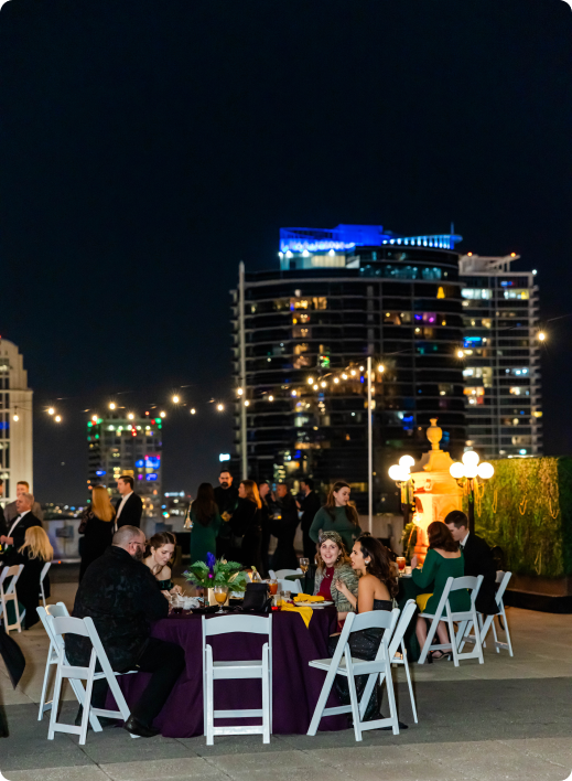 Guests moved between The Gallery, styled with dramatic Mardi Gras-inspired ceiling draping and cocktail-style mingling, and the rooftop terrace, where string lights and downtown skyline views set the tone for an elevated night under the stars. A lively mix of entertainment, including live performances and a DJ-driven dance floor, kept the energy high throughout the evening. Curated food and bar stations allowed guests to grab a bite, toast the year, and stay in the moment. The result was a memorable Downtown Orlando corporate holiday party that felt immersive, social, and unmistakably Balcony.
